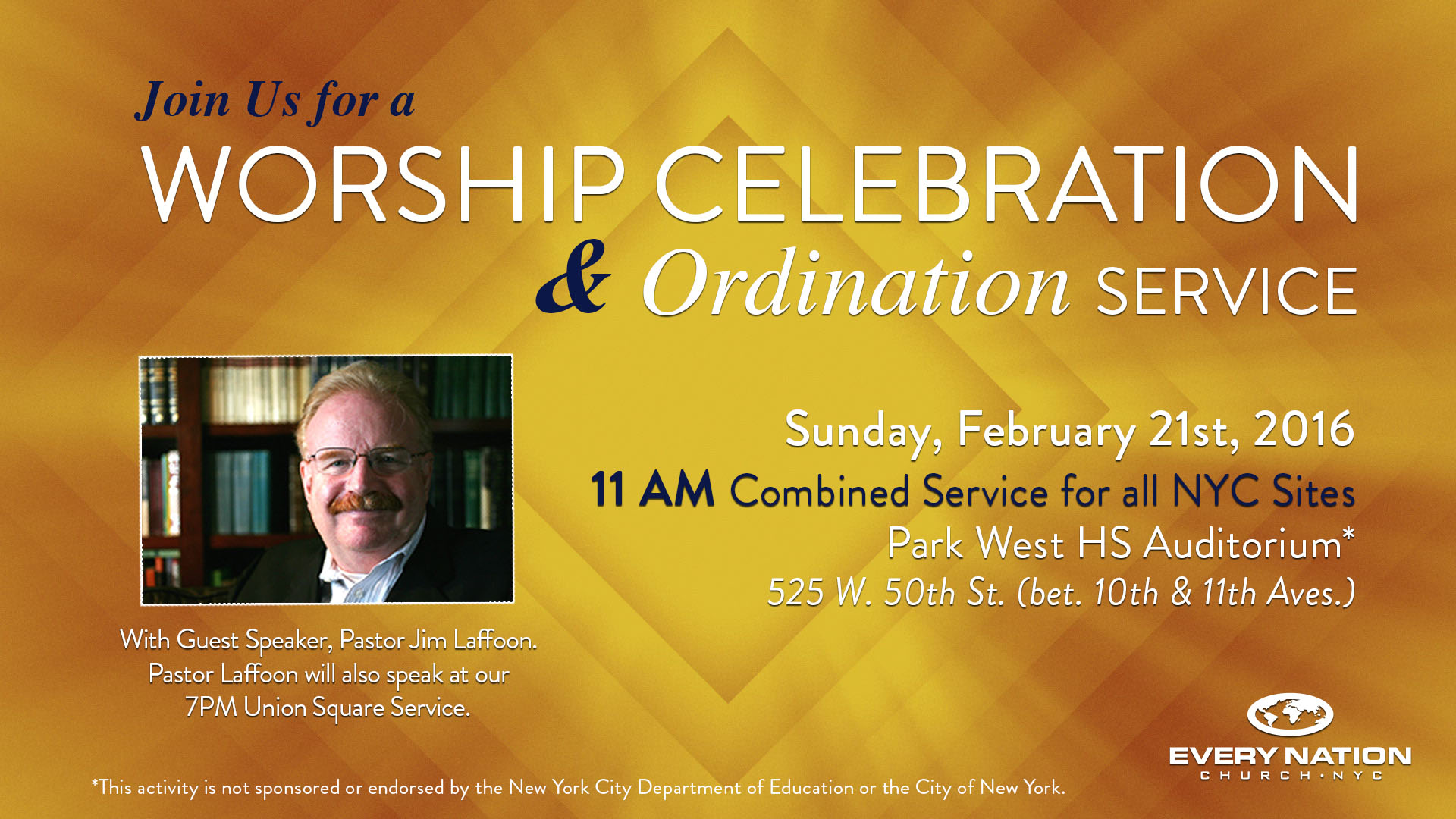 On Sunday, February 21 all Every Nation sites will combine for a worship celebration and special ordination service at 11am at Park West High School. During the service we will ordain new Elders and Deacons as well as recognize new ministers being raised up in our congregation. Pastor Jim Laffoon will be our guest speaker. In addition, Pastor Jim Laffoon will be speaking at our 7:00PM site at Union Square.