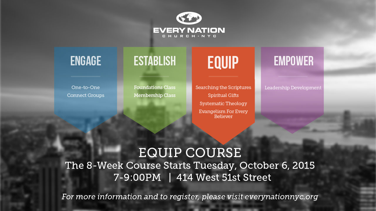 Equip Course covers the topics of “Searching the Scriptures”, “Spiritual Gifts”, “Systematic Theology”, and “Evangelism for Every Believer” in 8 weeks and one Saturday Class. These are highly recommended classes for all those who completed the Membership Class and the Foundations Class at Every Nation New York City. All classes will be held at 414 W 51st Street. Classes begin Tuesday, October 6th 2015