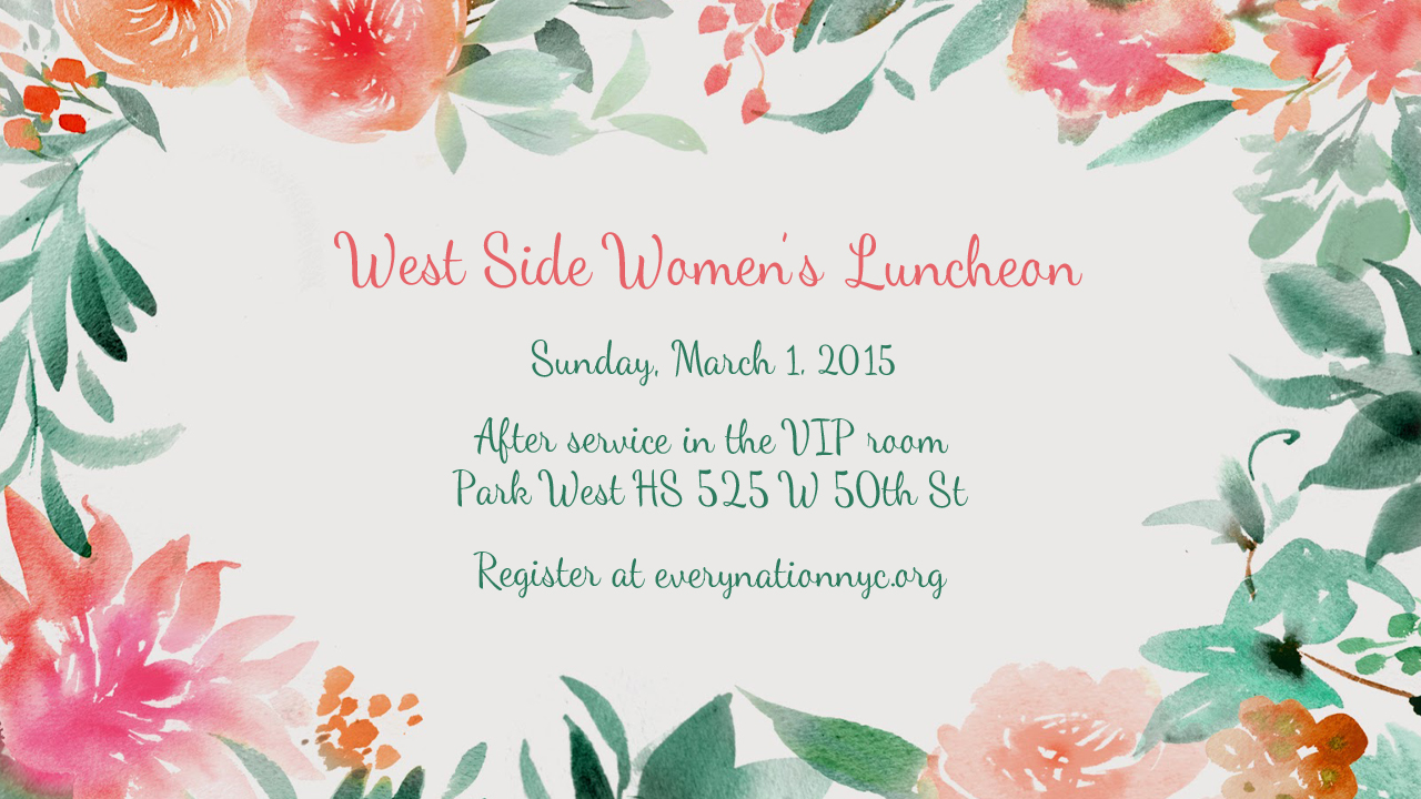 Join us for a West Side Women’s Luncheon on Sunday, March 1st after service in the VIP room of Park West HS (525 W 50th St.). Vicky DeRosa will be sharing an encouraging word so RSVP today to attend.