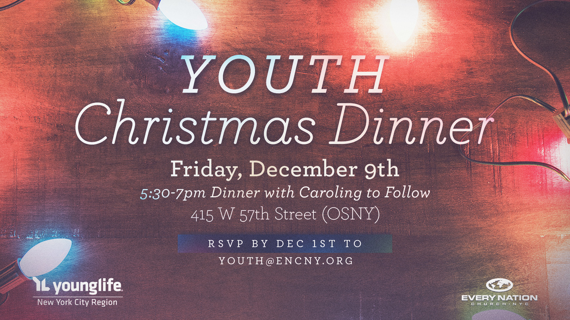Youth Christmas Dinner by admin | Nov 22, 2016 | News and Updates Friday, December 9th 5:30-7pm dinner with caroling to follow 415 W 57th St (OSNY) RSVP by Dec 1st @[email protected] Click to share on Facebook (Opens in new window) Facebook Click to share on X (Opens in new window) X